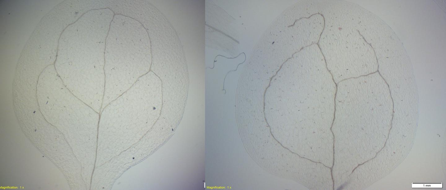 image: When the scientists removed one part of the receptor -- CANAR, the plant's veins were formed seemingly randomly (right side). The left side shows the normal vein formation.