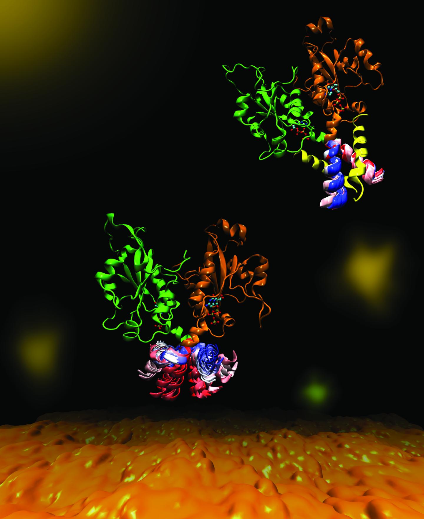Cornell and her project team - a collaboration with Peter Tieleman and graduate student, Mohsen Ramezanpour at the University of Calgary and Jaeyong Lee and Svetla Taneva, research associates at SFU - thought that the answer must have to do with the dynamic changes in shape that the enzyme undergoes when it binds to a membrane. But these changes are difficult to capture with traditional structural biology methods like x-ray crystallography, which take a static snapshot of molecules. Instead, the team used computational simulations of molecular dynamics, which use information about the forces between every individual atom in a molecule to calculate the trajectories of the enzyme's moving parts.
