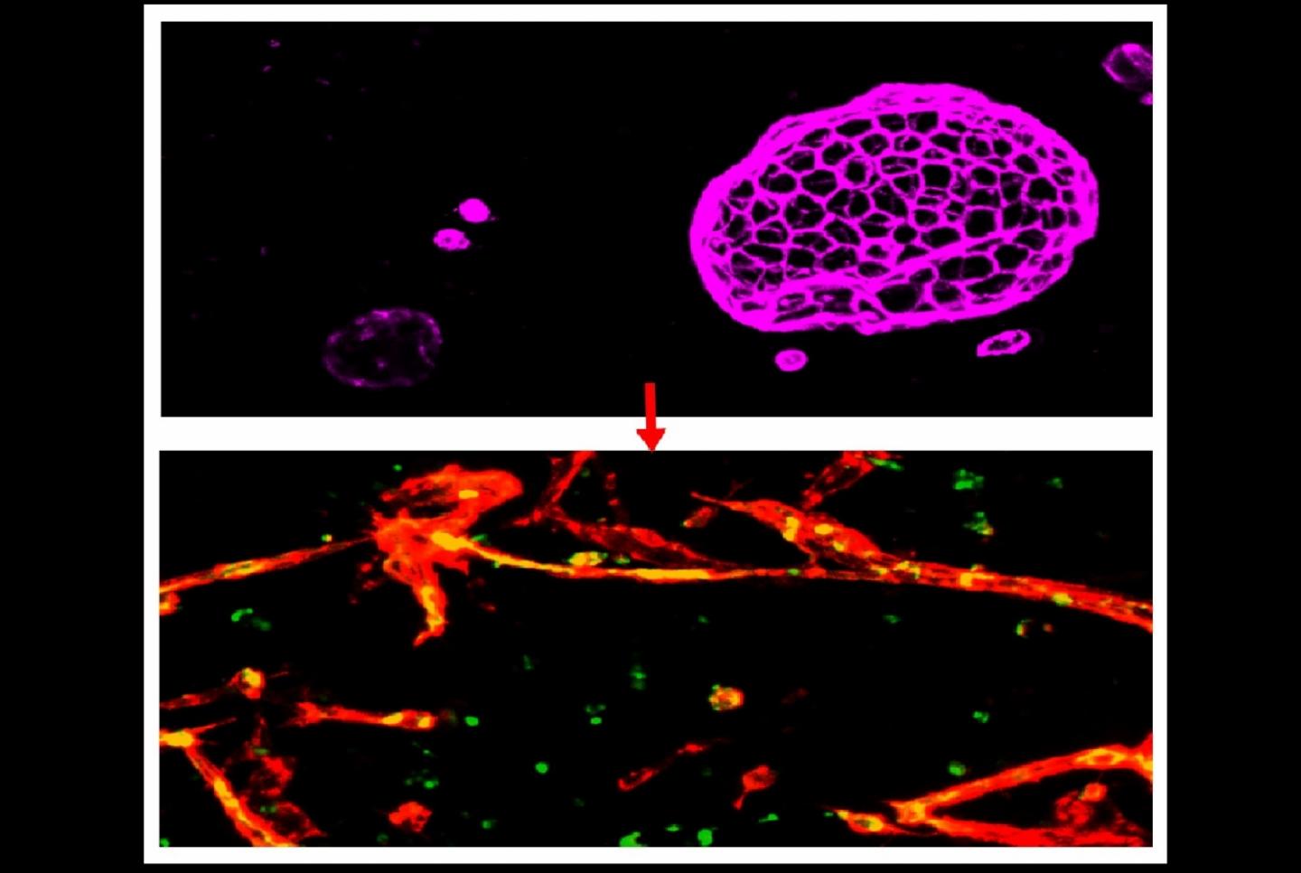 image: Induced brain microvascular endothelial cells (IBMECs) (top panel) cultured in 3D assume an epithelial organoid structure and express the epithelial cell marker EPCAM (purple). When they are reprogrammed by overexpression of ETV2, ERG and FLI1, they lose EPCAM expression, acquire vascular markers VE-Cad (red) and PECAM1 (green) and are able to fulfill the function of endothelial cells - forming blood vessels (bottom panel).