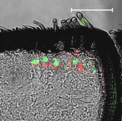 Tissue section of a male Manduca sexta antenna. Red and green areas are evidence for transcripts of two different odorant receptors (scale: 50 micrometers).