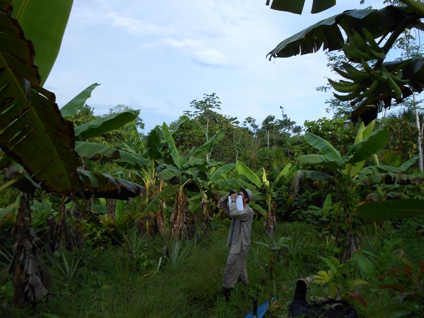 image: Jacob Socolar, lead author of the study, conducts a point-count in a smallholder farmer's banana cultivation.