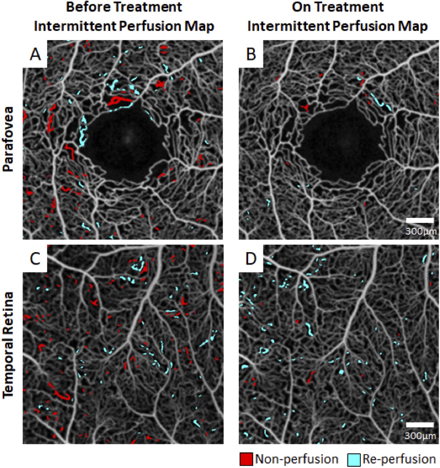 image: column) and repeated imaging again after two months of hydroxyurea treatment (right column). Before treatment, the patient exhibited between-session IPI of 3.0% and 2.7% respectively at the parafovea (A) and temporal retina (C). After two months of hydroxyurea, the between-session IPI was reduced to 0.5% and 1.6% respectively at the parafovea (B) and temporal retina (D).