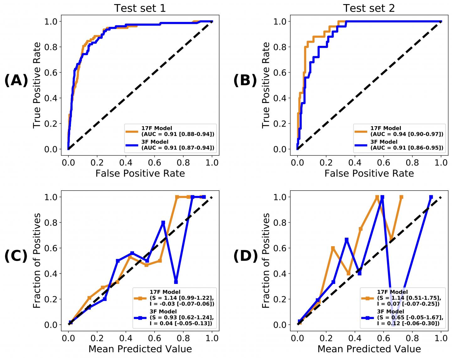 image: Evaluation results for test datasets 1 (A) and 2 (B) are shown here in terms of the ROC curves obtained, as well as their AUC scores, with 95% CIs in parentheses. Calibration curves of the 3F and 17F models on test datasets 1 (C) and 2 (D), with the slopes and intercepts of all the curves, along with their 95% CIs in parentheses. AUC=area under