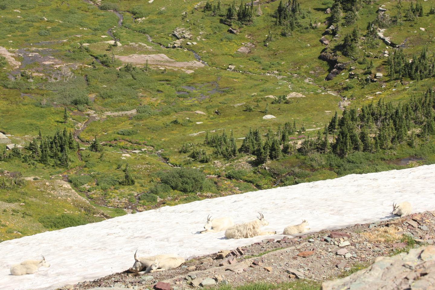 Researchers from the University of Montana, Glacier National Park, and Wildlife Conservation Society (WCS) found that mountain goats (Oreamnos americanus) in Glacier National Park seek out patches of snow in the summertime to reduce heat stress. When they do, breathing rates went down, a behavioral strategy that results in less energy expended.