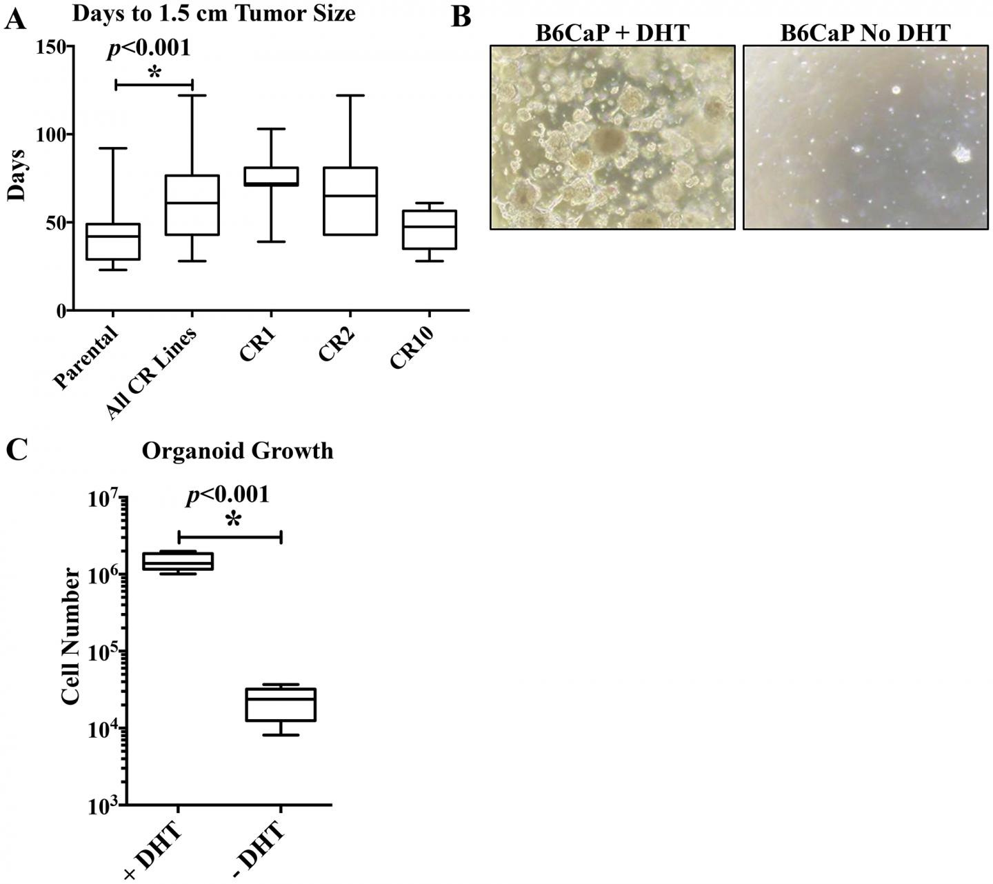image: in vivo and ex-vivo growth kinetics of B6CaP. Growth rates of CR sublines in castrate hosts, measured as time from injection to 1.5 cm tumor size, was significantly slower than parental B6CaP cells in intact hosts (A, 42.9 vs 63.3 days, p