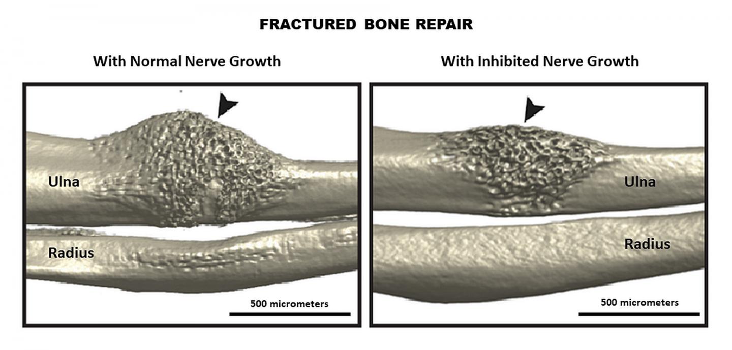 "Among the mice lacking TrkA signaling, there was a significant reduction -- as much as 80% compared with a control group of normal functioning mice -- in the number of nerve fibers that appeared at the fracture site," James says. "We also saw fewer osteoblasts [bone-producing cells] and in turn, less mineralization of new bone."