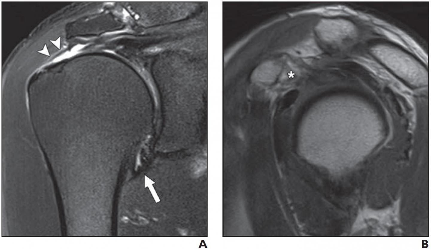 B: Oblique sagittal proton density MR image shows preserved subcoracoid fat triangle (asterisk)