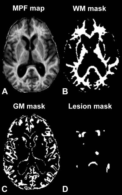 These are example axial sections of a three-dimensional MPF map (A) obtained from a 63-year old woman with SPMS disease course and results of brain tissue segmentation (B-D). Segmentation masks corresponding to white matter (WM) (B), gray matter (GM) (C), and lesions (D) were used to calculate mean MPF values in each tissue.