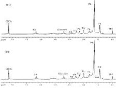 This image shows a typical 1H-nuclear magnetic resonance spectrum of the lipid-soluble metabolites of human umbilical cord mesenchymal stem cells.The concentration of glutamate extracted with the dual phase extraction method (lower) was higher than that obtained with the methanol-chloroform method (upper).FA: Fatty acids; TMS: tetramethylsilane; DPE: dual phase extraction.
