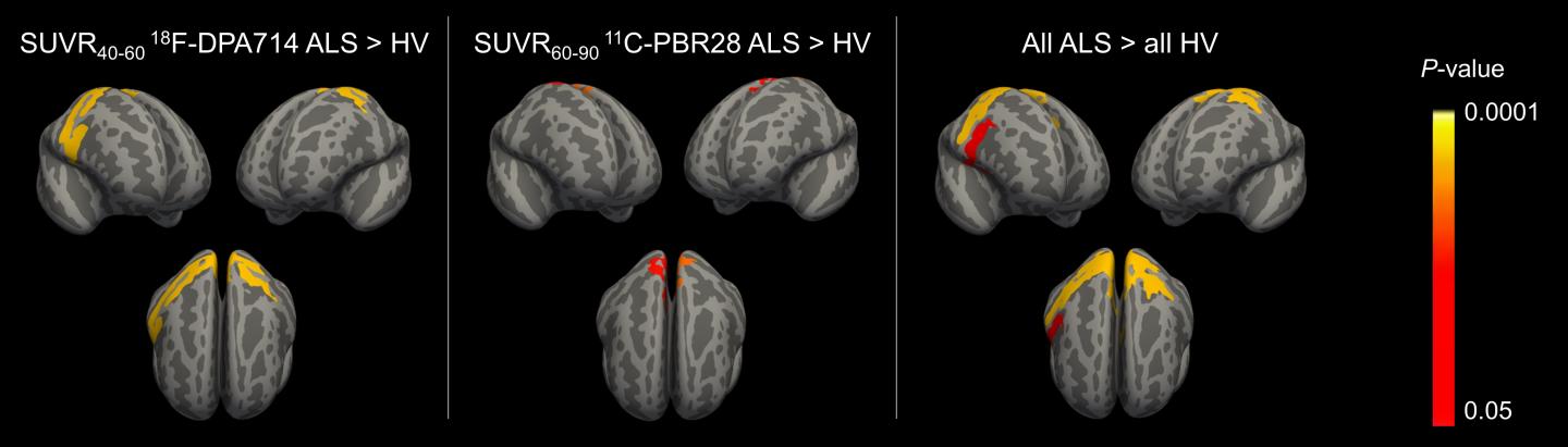 ALS patients and healthy volunteers from the United States and Belgium were recruited for the study and underwent dynamic 18F-DPA714 or 11C-PBR28 PET/MRI (magnetic resonance imaging). Data from the 18F-DPA714 or 11C-PBR28 images were analyzed, and results were compared.