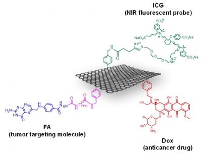 Developed by Prof. Eijiro Miyako from JAIST (Nomi, Japan), Dr. Alberto Bianco from CNRS (Strasbourg, France), and their international teams, the multi-functional graphene as a drug delivery carrier are successfully synthesized with "three" type of molecules such as near-infrared (NIR) fluorescent probe (indocyanine green; ICG), tumor targeting molecule (Folic acid: FA), and anticancer drug (doxorubicin; Dox) by a covalent chemical modification technique (Figure 1). ICG (green color part in the picture) was chosen as fluorophore to follow the uptake and to track the material inside the cells. FA (blue) was covalently bound through a polyethylene glycol (pink) linked to graphene, to specifically target the cancer cells, and Dox (red) was used as anticancer drug.
