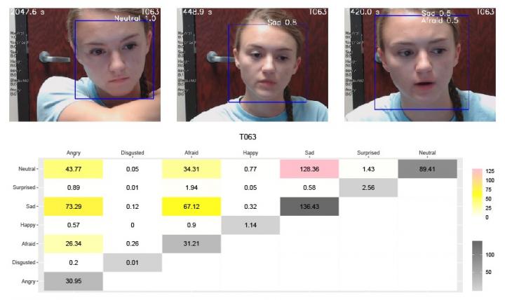 Bottom: Emotional co-occurrence results for the hour-long monitoring period. The matrix diagonal quantifies the presence of single emotions, while the off-diagonal elements of the matrix quantify the presence of mixed emotions.