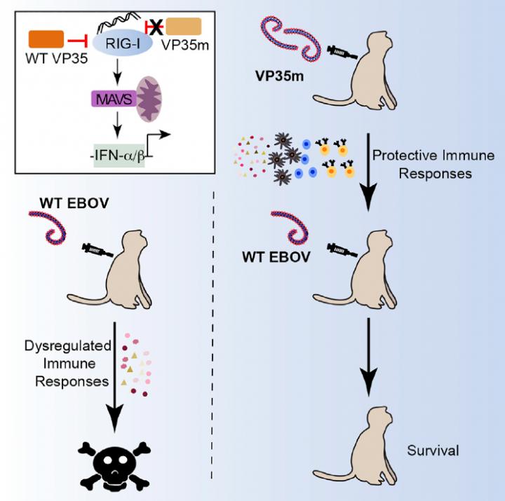 "These data demonstrate that VP35 is a critical Ebola virus immune-evasion factor and provide insights into immune mechanisms of Ebola virus control," Basler says. "We show that VP35 suppression of interferon responses is a key requirement for Ebola virus to cause disease, and VP35 function impacts not only innate antiviral defenses but also adaptive immune responses. Because it is critical for virulence, the interferon-suppressing function of VP35 is a potential drug target."