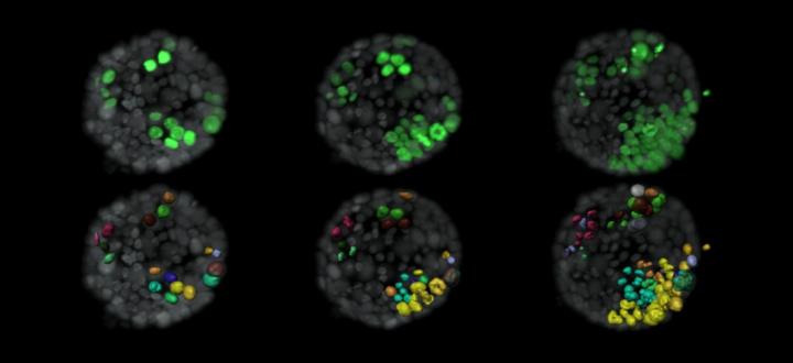 image: Evolution of tumour cells (green) within a normal organoid (grey). The lower panel shows surface rendition of tumour cells and labels new cells that arise from a single cell in the same colour.