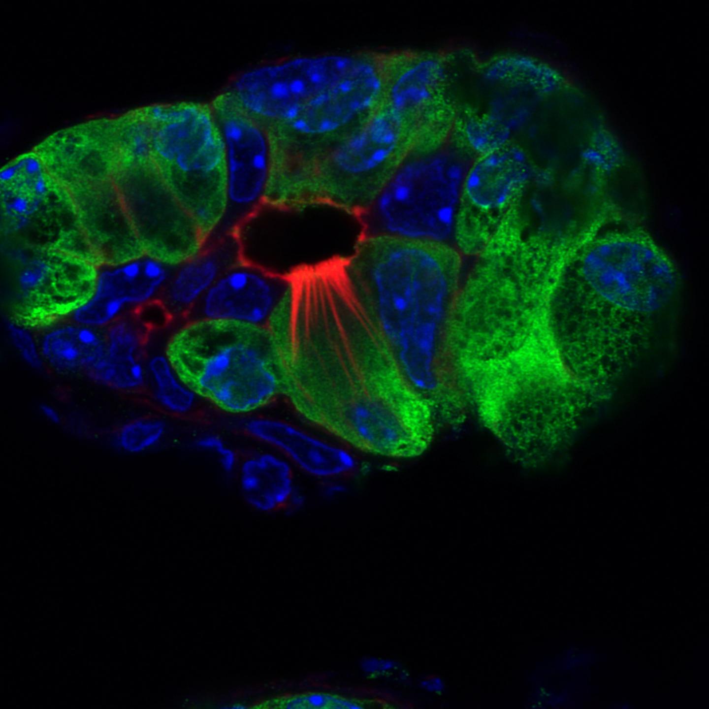 image: Pancreatitis tuft cells (red, microvilli and actin rootlets) in the injured pancreas (green); nuclei (blue).