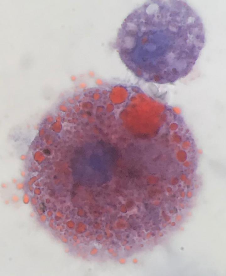 U of U Health investigators identified the lipid-laden macrophages in six out of six cases seen at University of Utah Hospital in Salt Lake City by the time of submitting the results for publication. The cells were found in samples after performing a procedure called bronchoalveolar lavage where fluid is squirted into a small section of the lungs and then collected for examination. Macrophages are a type of cell from the immune system that gather at sites of infection and perform the role of cleaning up debris. Staining them with a dye called Oil-red-O highlighted the oily droplets littered throughout these cells.