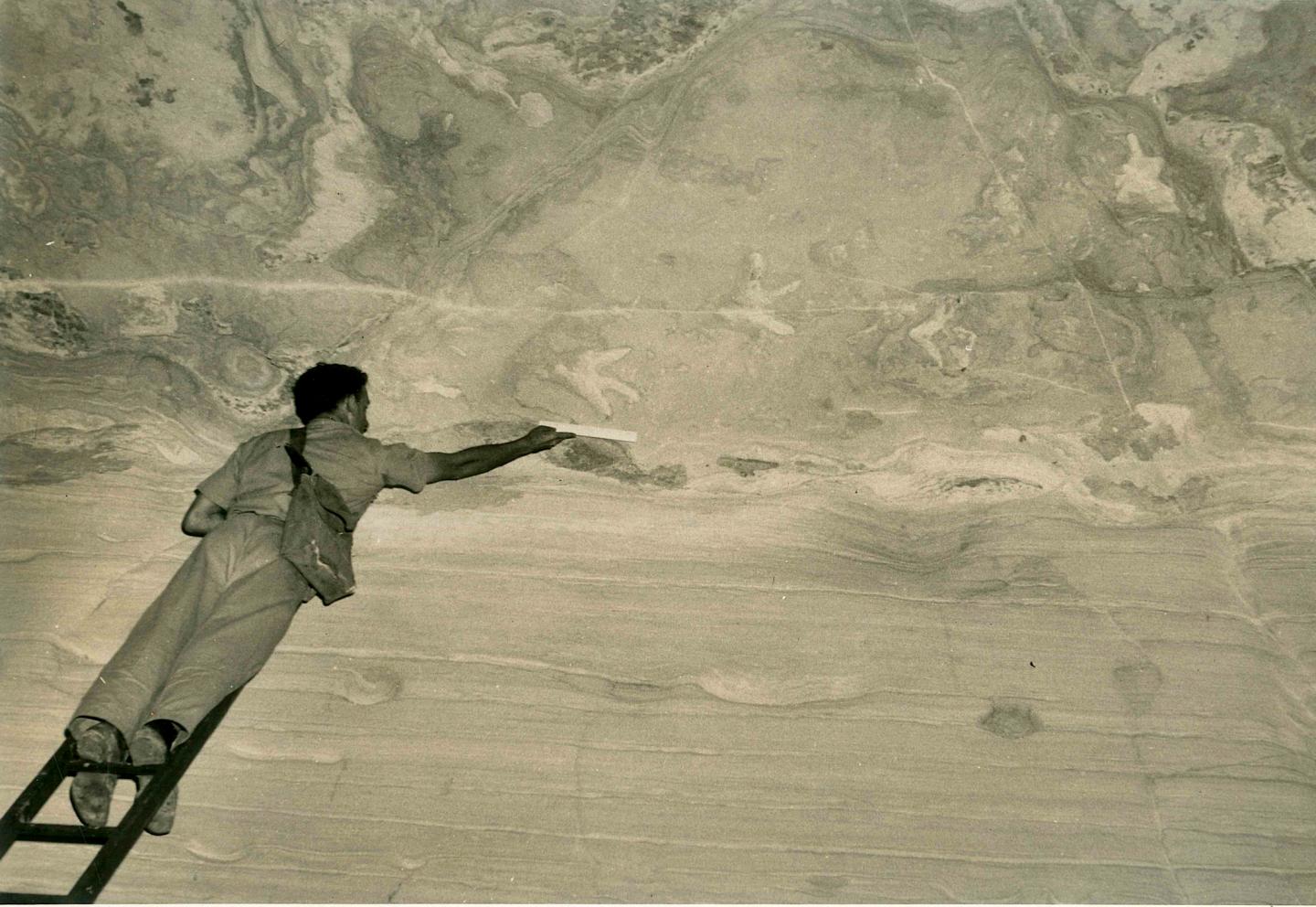 image: Ross Staines measuring the footprints 4.5 metres above the cave floor (c. 1954).