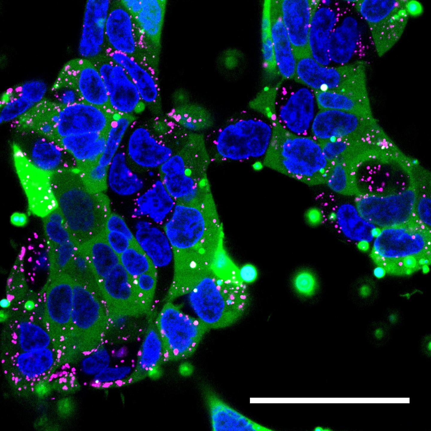 image: Confocal microscopy image of human embryonic kidney cells. Nanoparticles filled with human immunoglobulin were delivered to the cells. The cell nucleus is blue, endosomes (which sequester materials taken up by cells) are labeled in pink, and the immunoglobulin proteins are labeled with a green fluorescent tag. The nanoparticle's cargo has spread widely through most of the cells (green) without it being trapped in endosomes.