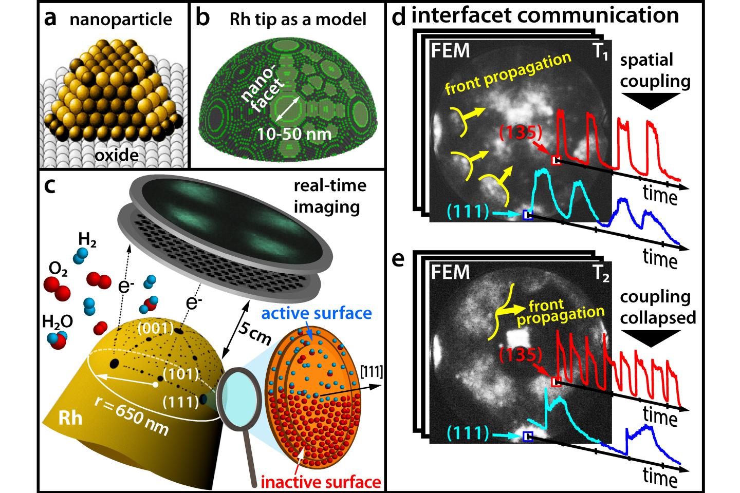 image: (a) Modern cataylsts constist of nanoparticles; (b) A Rhodium tip as a model for a nanoparticle; (c) Tracing a chemical reaction in real time with a field emission microscope (d) At low temperatures, different facets oscillate in sync (e) At higher temperatures, synchronicity is broken