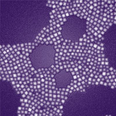 This is a transmission electron microscopy image of nanoparticles designed for deep-tissue imaging. Each particle consists of a core encased inside a square, calcium-fluoride shell.