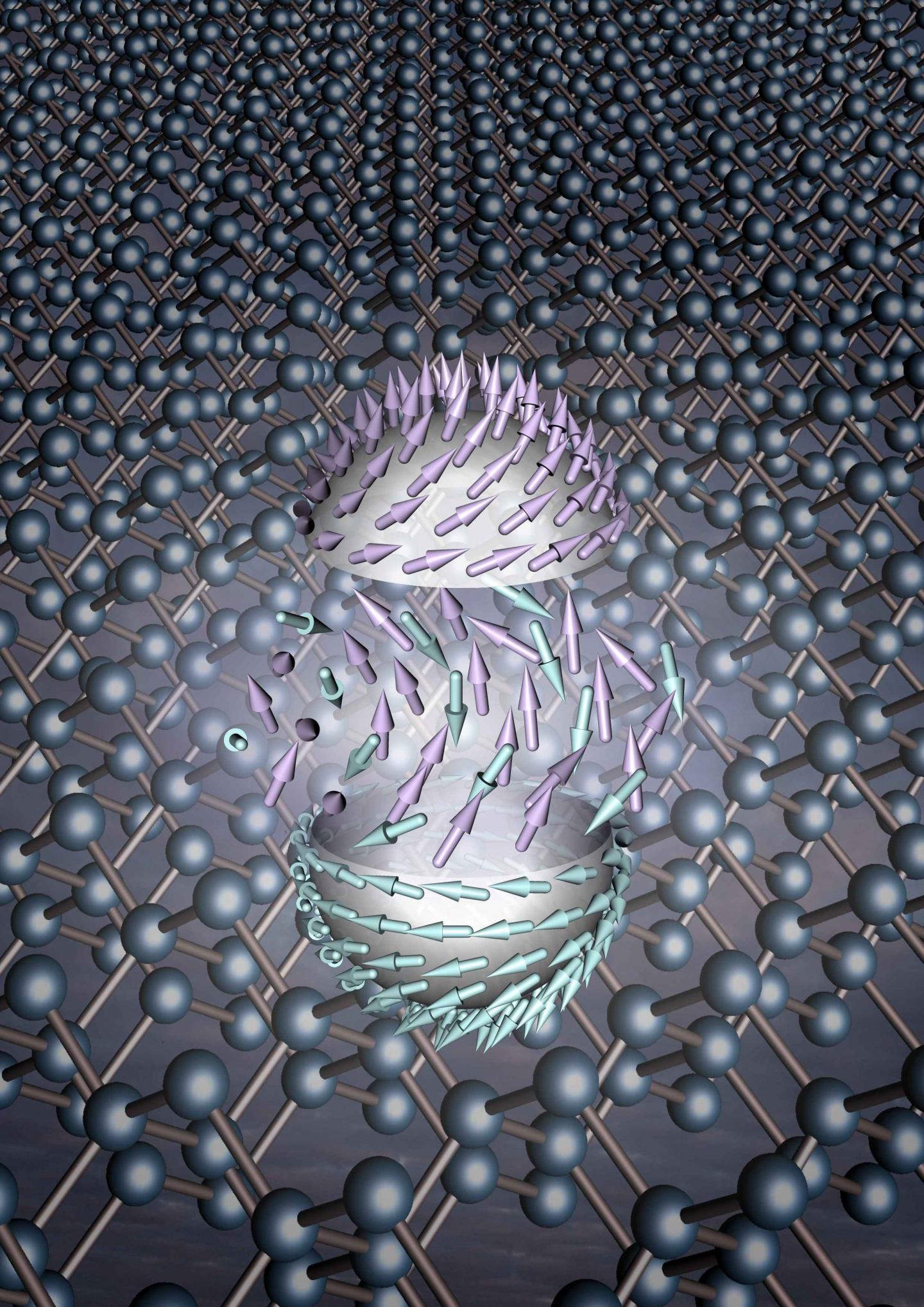 The scientists created their new type of skyrmion by fabricating them in a customised antiferromagnetic crystal. Zaharko explains: "Antiferromagnetic means that adjacent spins are in an antiparallel arrangement, in other words one pointing upwards and the next pointing downwards. So what was initially observed as a property of the material we subsequently identified within the individual skyrmions as well."