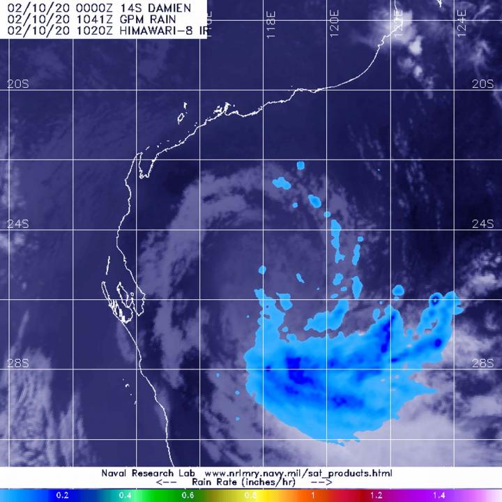 image: On Feb. 10 at 5:41 a.m. EST (1041 UTC), GPM passed over Western Australia and measured the rate of rainfall from Damien's remnants. GPM showed heaviest rainfall occurring south of the center and falling at a rate of at least 5 mm/0.2 inches (dark blue) per hour.