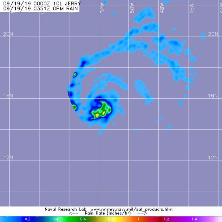 The GPM's core satellite passed over Tropical Storm Jerry in the Atlantic Ocean on Sept. 18 at 11:51 p.m. EDT (Sept. 19 at 0351 UTC). GPM found the heaviest rainfall stretching from the eastern to southern side of the storm where it was falling at a rate of over 25 mm (about 1 inch) per hour there and in a fragmented band of thunderstorms west of center. Forecasters at NOAA's National Hurricane Center or NHC incorporate the rainfall data into their forecasts.