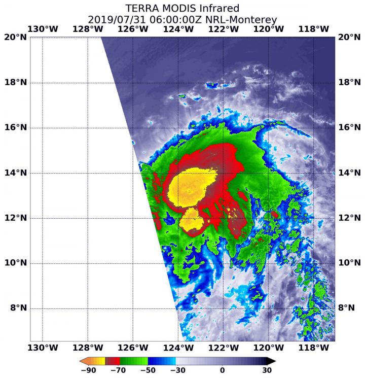 On July 31, the strongest storms were located around the center and in a band of thunderstorms southwest of the center where cloud top temperatures were as cold as minus 80 degrees Fahrenheit (minus 62.2 Celsius). Cloud top temperatures that cold indicate strong storms with the potential to generate heavy rainfall.
