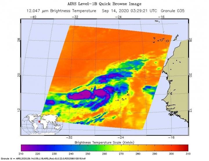image: On Sept. 14 at 0329 UTC (Sept. 13 at 11:29 a.m. EDT) NASA's Aqua satellite analyzed a low-pressure area in the eastern Atlantic Ocean using the Atmospheric Infrared Sounder or AIRS instrument. AIRS found coldest cloud top temperatures as cold as or colder than (purple) minus 63 degrees Fahrenheit (minus 53 degrees Celsius) around the center of circulation, as the storm was forming into Tropical Depression 21.