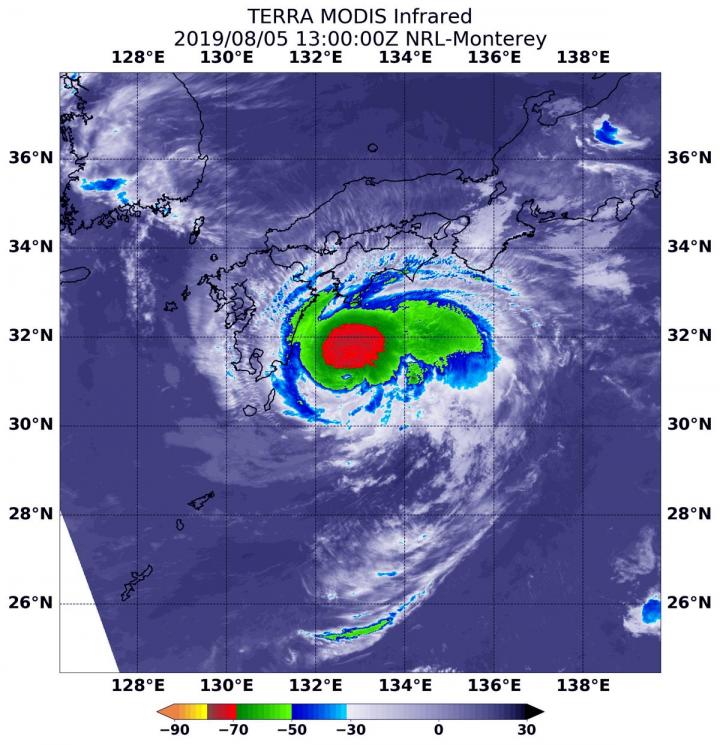 On Aug. 5 at 9 a.m. EDT (1300 UTC), the Moderate Imaging Spectroradiometer or MODIS instrument that flies aboard NASA's Aqua satellite found strongest thunderstorms had cloud top temperatures as cold as minus 70 degrees Fahrenheit (minus 56.6 Celsius). Cloud top temperatures that cold indicate strong storms with the potential to generate heavy rainfall.