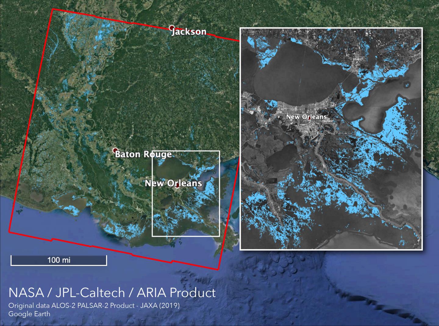 image: NASA's Advanced Rapid Imaging and Analysis (ARIA) team created this Flood Proxy Map (FPM) depicting areas of Louisiana that are likely flooded as a result of heavy rain and Tropical storm Barry, shown by light blue pixels. The map covers an area of 220 by 236 miles (355 by 380 kilometers), shown by the large red polygon.