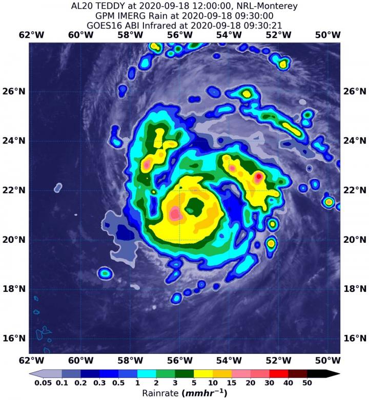 NASA's Integrated Multi-satellitE Retrievals for GPM or IMERG, which is a NASA satellite rainfall product, estimated on Sept. 18 at 8 a.m. EDT (1200 UTC), Hurricane Teddy was generating as much as 30 mm (1.18 inches) of rain per hour on the western side of its eye. That was the area of where the heaviest rainfall was occurring.