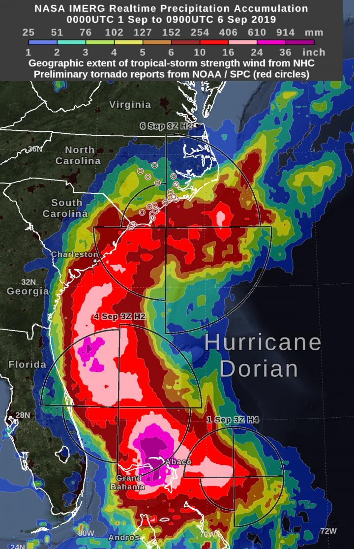 image: NASA's IMERG showed during the past day, most of the areas experiencing over 10 inches of rain accumulation remained offshore, while Dorian did drop heavy rain on South Carolina and North Carolina. The graphic shows the distance that tropical-storm force (39 mph) winds extend from Hurricane Dorian's low-pressure center, as estimated by the National Hurricane Center. The Saffir-Simpson intensity category is the number following the "H" in the label on the image. The preliminary reports of tornadoes were obtained from NOAA's Storm Prediction Center, and are shown on the graphic as red circles.