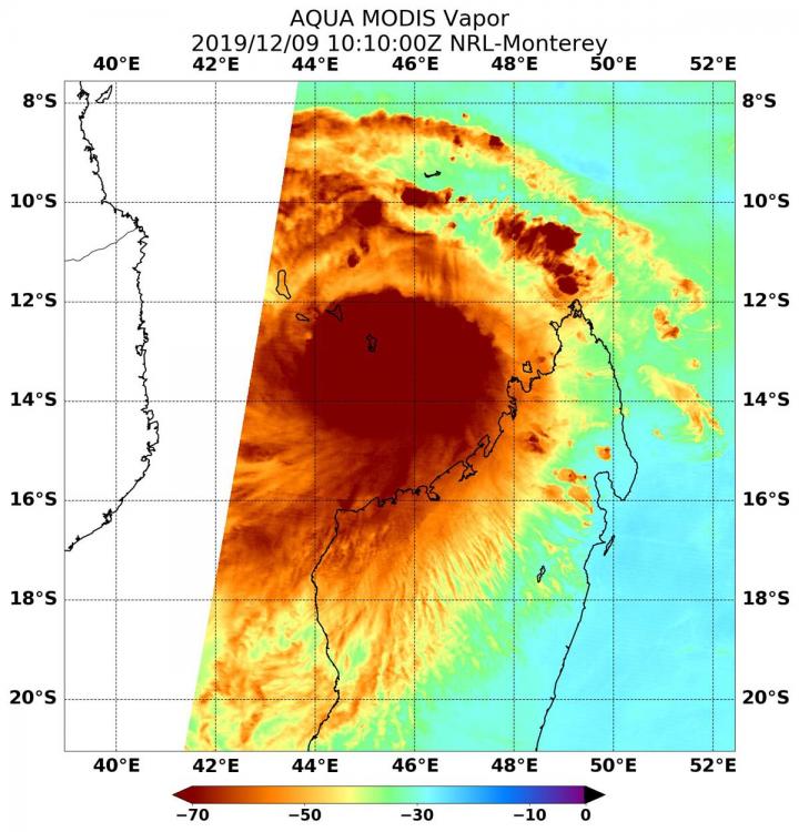 image: NASA's Aqua satellite passed over Tropical Cyclone Belna in the Southern Indian Ocean on Dec. 9 at 5:10 a.m. EST (1010 UTC). Aqua found the highest concentrations of water vapor (brown) and coldest cloud top temperatures were around the center.