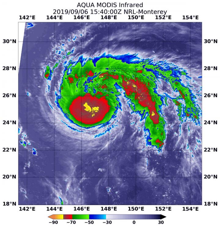 image: On Sept. 6 at 11:40 a.m. EDT (1540 UTC), the MODIS instrument that flies aboard NASA's Aqua satellite showed the classic comma-shaped Tropical Storm Faxai where the strongest thunderstorms had cloud top temperatures as cold as minus 80 degrees (yellow) Fahrenheit (minus 62.2 Celsius).