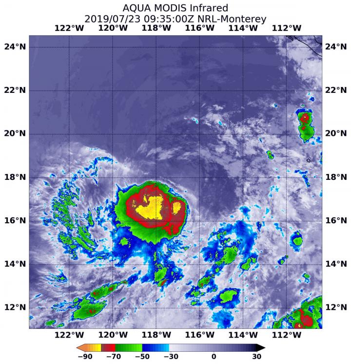 On July 23 at 5:35 a.m. EDT (0935 UTC), the Moderate Imaging Spectroradiometer or MODIS instrument that flies aboard NASA's Aqua satellite gathered infrared data on the strengthened Tropical Storm Dalila. Strongest thunderstorms had cloud top temperatures as cold as minus 80 degrees Fahrenheit (minus 62.2 Celsius). Cloud top temperatures that cold indicate strong storms with the potential to generate heavy rainfall.