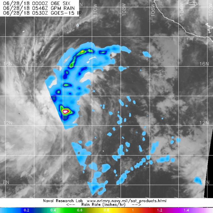 image: The GPM core observatory satellite passed over Tropical Depression Six-E on June 28 at 1:30 a.m. EDT (0530 UTC) as it was strengthening into a tropical storm. Powerful storms circling the center of the depression and in a band extending north of center were producing rainfall at a rate greater than 1.4 inches per hour. GPM data was overlaid on NOAA's GOES-West satellite infrared imagery.