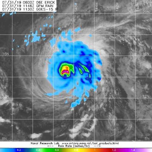 image: The GPM core satellite passed over Hurricane Erick at 7:46 a.m. EDT (1146 UTC) on July 31. GPM found the heaviest rainfall (pink) was around the northern eyewall of the center of circulation. There, rain was falling at a rate of over 40 mm (about 1.6 inches) per hour.