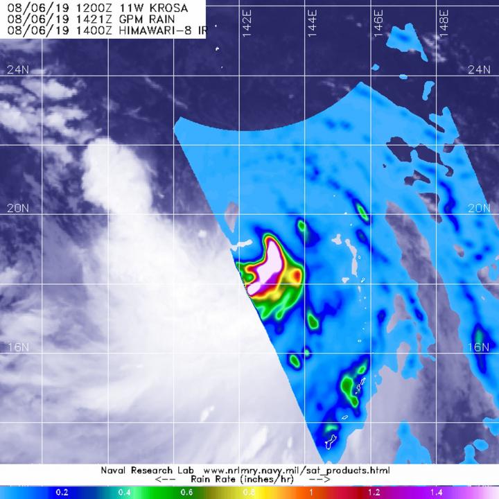 The Global Precipitation Measurement mission or GPM core satellite passed over Tropical Storm Krosa at 10:21 a.m. EDT (1421 UTC) on August 6, 2019. GPM found the heaviest rainfall was east of the center of circulation falling at a rate of 50 mm (about 2 inches) per hour, over open ocean GPM is a joint mission between NASA and the Japan Aerospace Exploration Agency, JAXA.