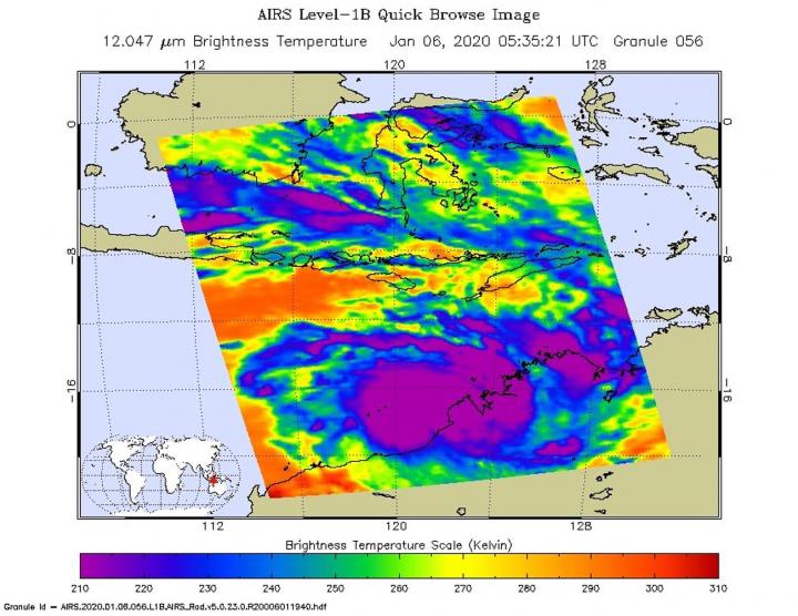 image: On Jan. 6 at 12:35 a.m. EST (0535 UTC/1:35 p.m. AWST) NASA's Aqua satellite analyzed Tropical Cyclone Blake's cloud top temperatures using the AIRS instrument. AIRS showed the strongest storms contained cloud top temperatures as cold as or colder than 210 Kelvin (purple) minus 81 degrees Fahrenheit (minus 63.1 degrees Celsius) around the center.