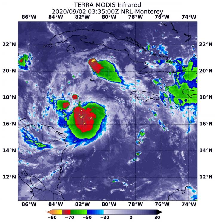 On Sept. 1 at 11:35 p.m. EDT (Sept. 2 at 335 UTC), the Moderate Resolution Imaging Spectroradiometer or MODIS instrument aboard NASA's Terra satellite gathered temperature information about Tropical Storm Nana's cloud tops. Strongest storms were around the center of the storm, where temperatures were as cold as or colder than minus 80 degrees (minus 62.2 degrees Fahrenheit). That area was surrounded by large area of slightly less powerful storms where cloud top temperatures were as cold as or colder than minus 70 degrees Fahrenheit (minus 56.6 Celsius).