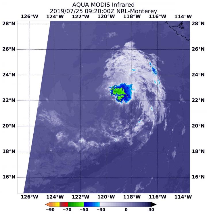On July 25 at 5:20 a.m. EDT (0920 UTC), the Moderate Imaging Spectroradiometer or MODIS instrument that flies aboard NASA's Aqua satellite gathered infrared data on Dalila. There was still a small area of strong thunderstorms with cloud top temperatures as cold as minus 50 degrees Fahrenheit (minus 45.5 Celsius). The National Hurricane Center or NHC noted, "Dalila is still technically a tropical cyclone based on the development of new convection within 70-75 nautical miles northeast of the center." That thunderstorm development was enough to maintain its classification as a tropical cyclone.