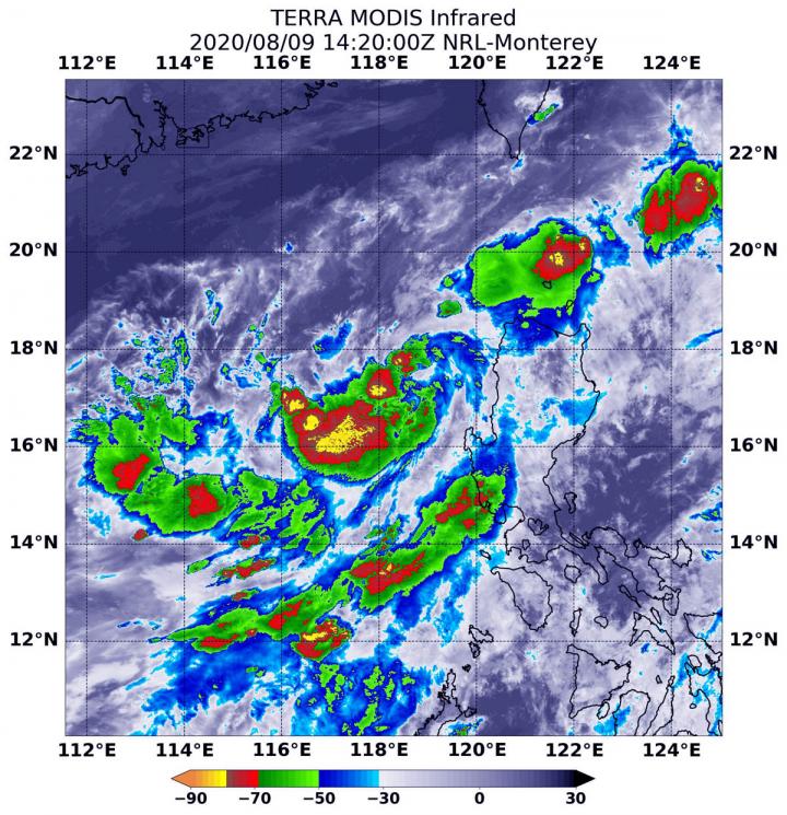 Infrared imagery gathered on Aug. 9 at 10:20 a.m. EDT (1420 UTC) was from the Moderate Resolution Imaging Spectroradiometer or MODIS instrument. MODIS flies aboard NASA's Terra satellite. MODIS gathered temperature information about 07W's cloud tops. Infrared data provides temperature information, and the strongest thunderstorms that reach high into the atmosphere have the coldest cloud top temperatures.