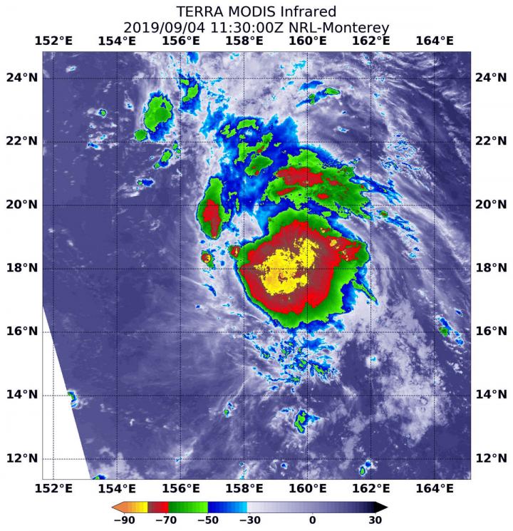 On Sept. 4 at 7:40 a.m. EDT (1130 UTC), the Moderate Imaging Spectroradiometer or MODIS instrument that flies aboard NASA's Terra satellite used infrared light to analyze the strength of storms within the 14W. NASA researches these storms to determine how they rapidly intensify, develop and behave.