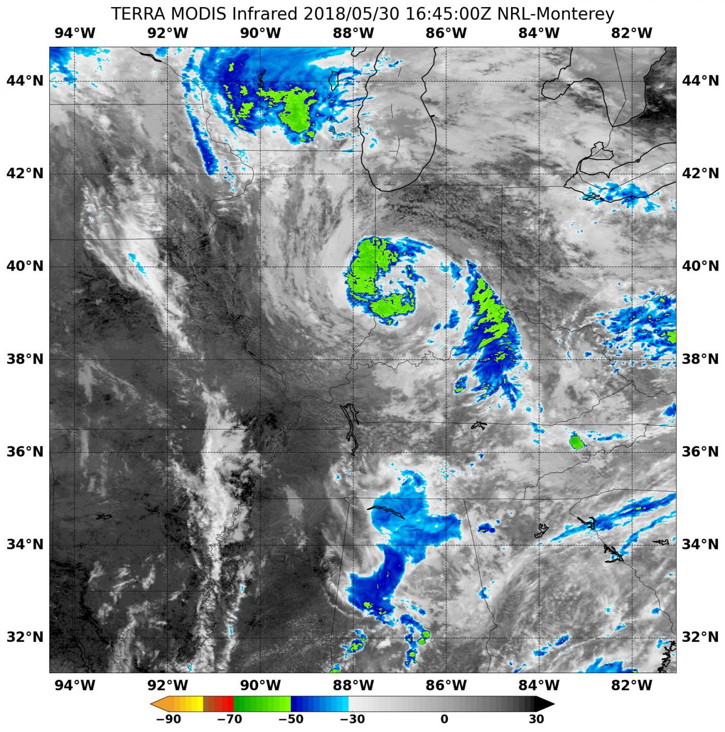 The Moderate Resolution Imaging Spectroradiometer or MODIS instrument aboard NASA's Terra satellite captured an infrared image of Subtropical Depression Alberto on May 30 at 12:15 p.m. EDT (1645 UTC) in the Ohio Valley. Terra showed strongest storms had cloud top temperatures as cold as or colder than minus 63 degrees Fahrenheit (minus 53 degrees Celsius). Storms with cloud tops that cold have been shown to generate heavy rain.