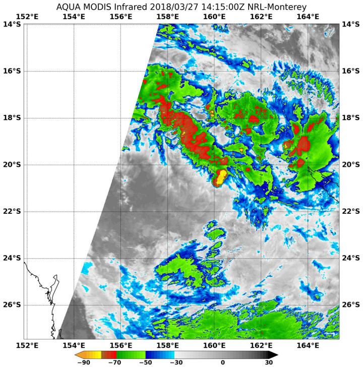 NASA's Aqua satellite passed over Iris on March 27 at 10:15 a.m. EDT (1415 UTC) and analyzed the storm in infrared light. The MODIS or Moderate Resolution Imaging Spectroradiometer instrument aboard NASA's Aqua satellite revealed three fragmented areas of thunderstorms where cloud top temperatures as cold or colder than minus 70 degrees Fahrenheit (minus 56.6 degrees Celsius). Cloud tops with temperatures that cold have the potential to generate very heavy rainfall. One area with those temperatures stretched from northwest to southeast while the other two areas were small and east of the center.