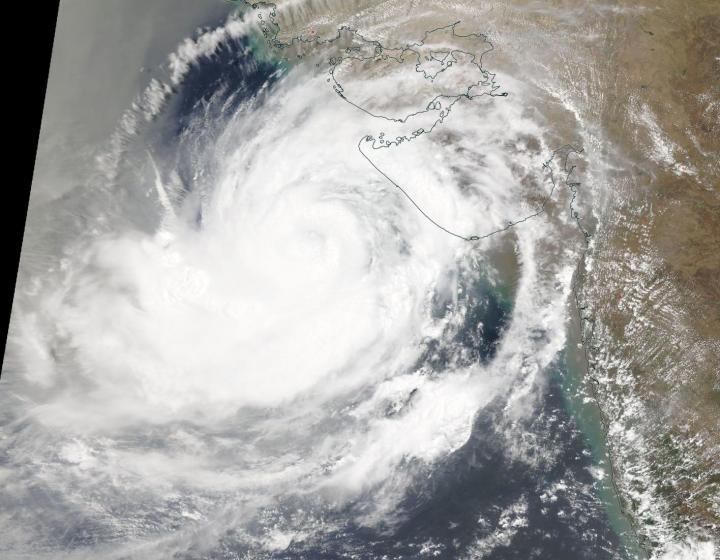 image: On June 14, 2019, the MODIS instrument aboard NASA's Terra satellite provided a visible image of Tropical Cyclone Vayu off India's Gujarat coast, western India.