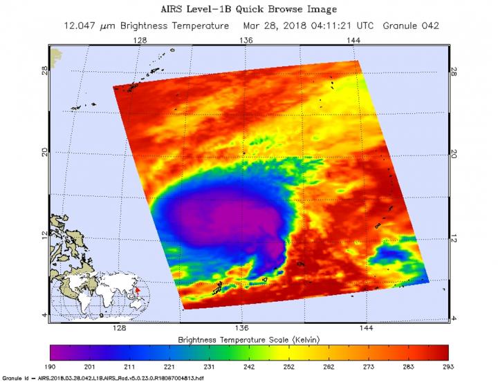 NASA's Aqua satellite passed over Jelawat on March 28 at 12:11 a.m. EDT (0411 UTC) and analyzed the storm in infrared light. Infrared light provides temperature data and that's important when trying to understand how strong storms can be. The higher the cloud tops, the colder and the stronger they are.