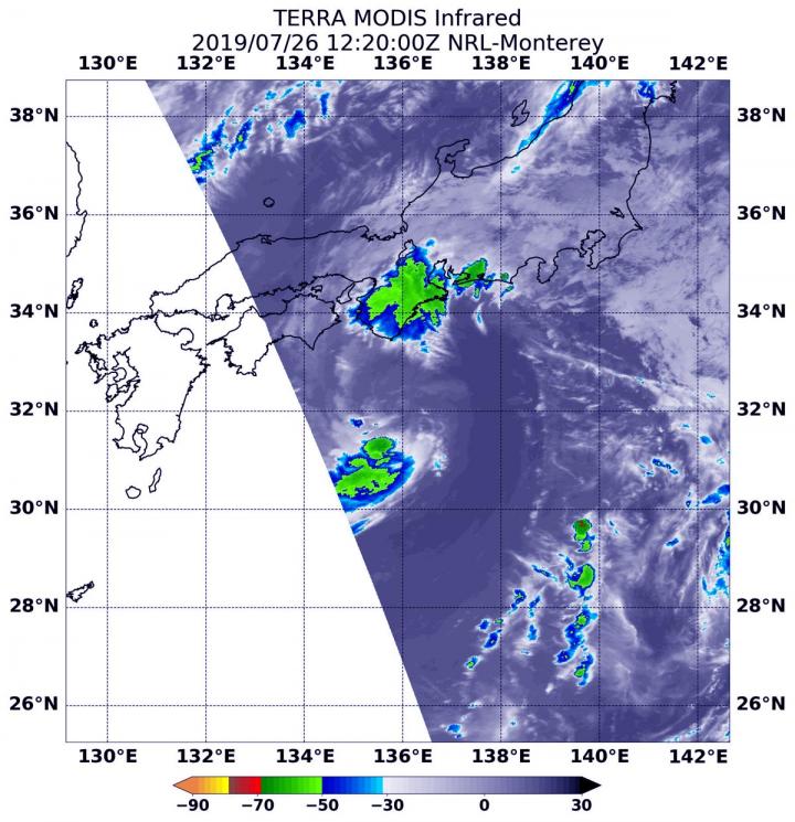 On July 26 at 8:20 a.m. EDT (1220 UTC), the Moderate Imaging Spectroradiometer or MODIS instrument that flies aboard NASA's Terra satellite gathered infrared data on Nari, formerly known as Tropical Storm 07W. There were two areas of strongest storms in Tropical Storm Nari, and they were north and south of the center of circulation. In those areas, thunderstorms had cloud top temperatures as cold as minus 50 degrees Fahrenheit (minus 45.5 Celsius). That northernmost area of strong storms was located over the Kyoto, Osaka and Wakayama Prefectures of Japan.