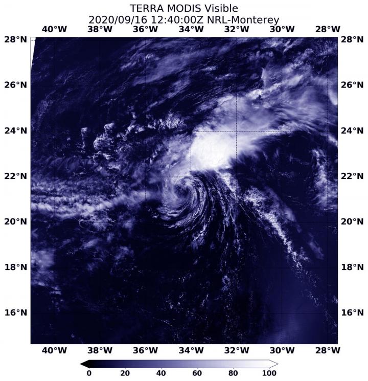 image: On Sept. 16, 2020 at 8:40 a.m. EDT (1240 UTC), NASA's Terra satellite provided a visible image of Tropical Storm Vicky battling wind shear in the eastern North Atlantic Ocean.